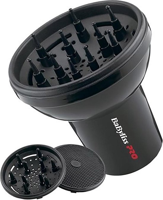 BaByliss PRO – 3 in 1 Diffuser heeft 3 verschillende opzetstukken! Voor golvend haar, extra lift of volledig pluisvrij haar! Bovendien wordt de luchtstroom gelijkmatiger over je haar verdeeld, zodat het minder snel statisch wordt en makkelijker in model te brengen is. Handige diffuser als extra aanvulling op je haardroger voor mooie krullen of golvend haar voor na het föhnen, van het topmerk Babyliss! De Babyliss Pro Diffuser heeft 3 verschillende opzetstukken, voor verschillende effecten. Ga voor schitterende golven, lift of volledig pluis-vrij haar! Deze diffuser past vrijwel op elke Babyliss Pro föhn! De wind wordt gelijkmatiger over je haar verdeeld waardoor het minder snel uitdroogt. Dankzij de pinnen kun je bovendien heel makkelijk krullen of golven creëren tijdens het föhnen!