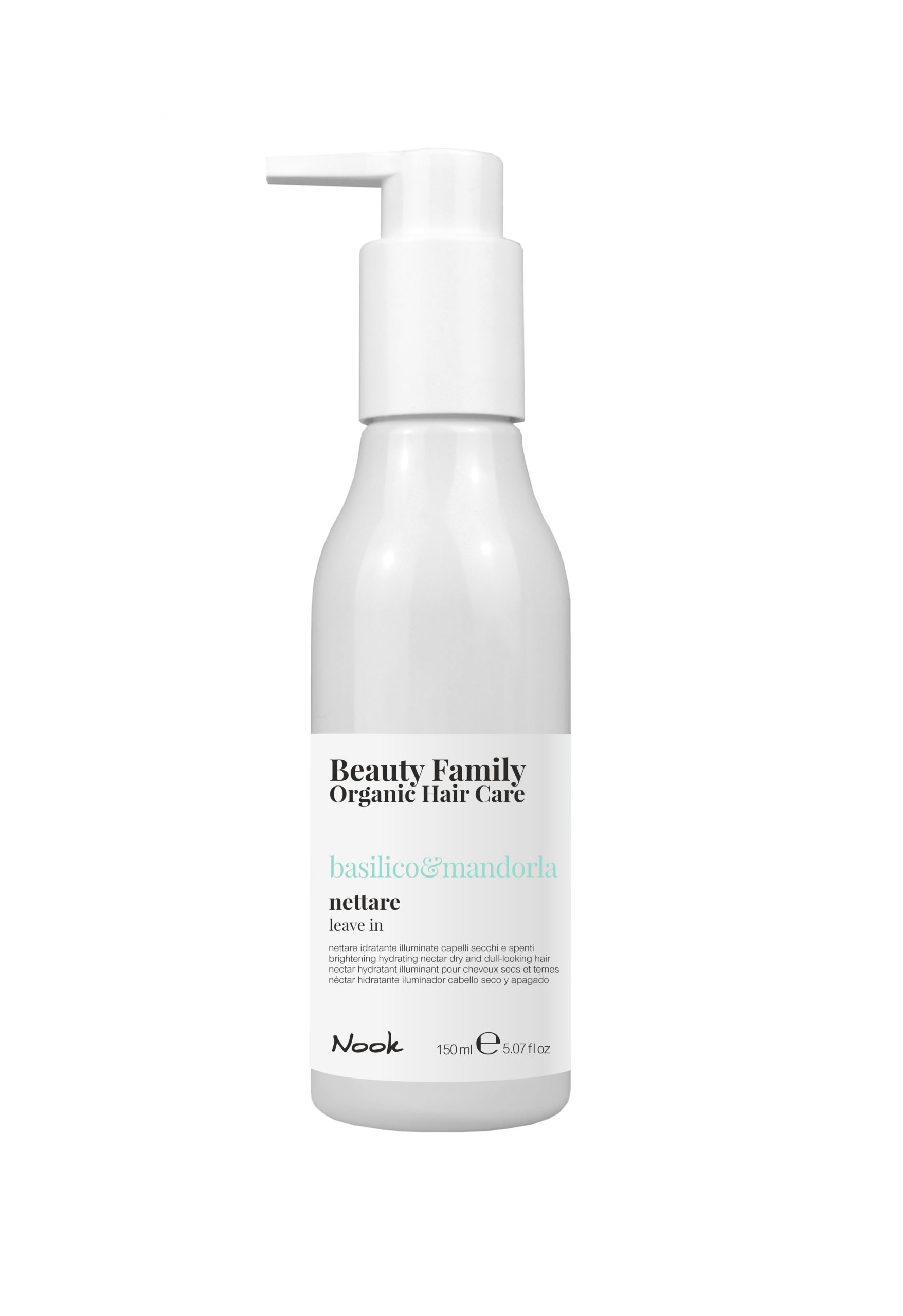 Basilico & Mandorla nettare leave-in van de Beauty Family Organic Hair Care lijn van Nook is een verhelderende hydraterende nectar voor droog en futloos haar.