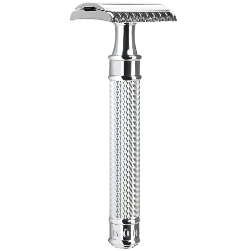 Safety razor met open kam in verchroomde uitvoering. Gewicht 80 gram, 10,7 cm hoog. (XL)