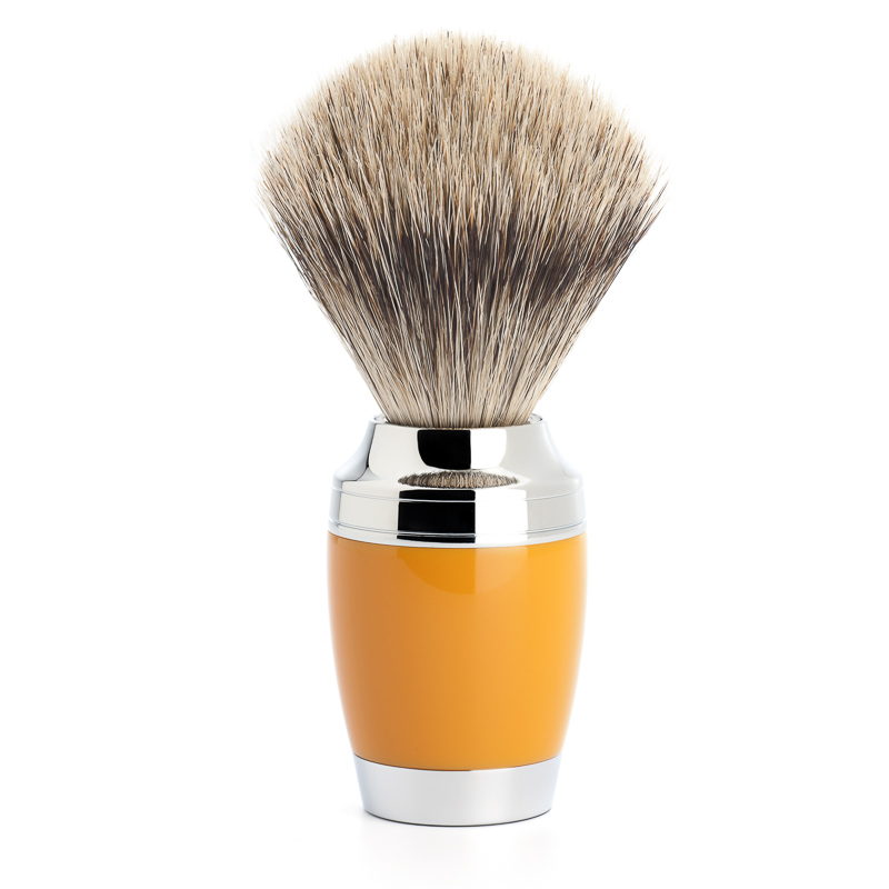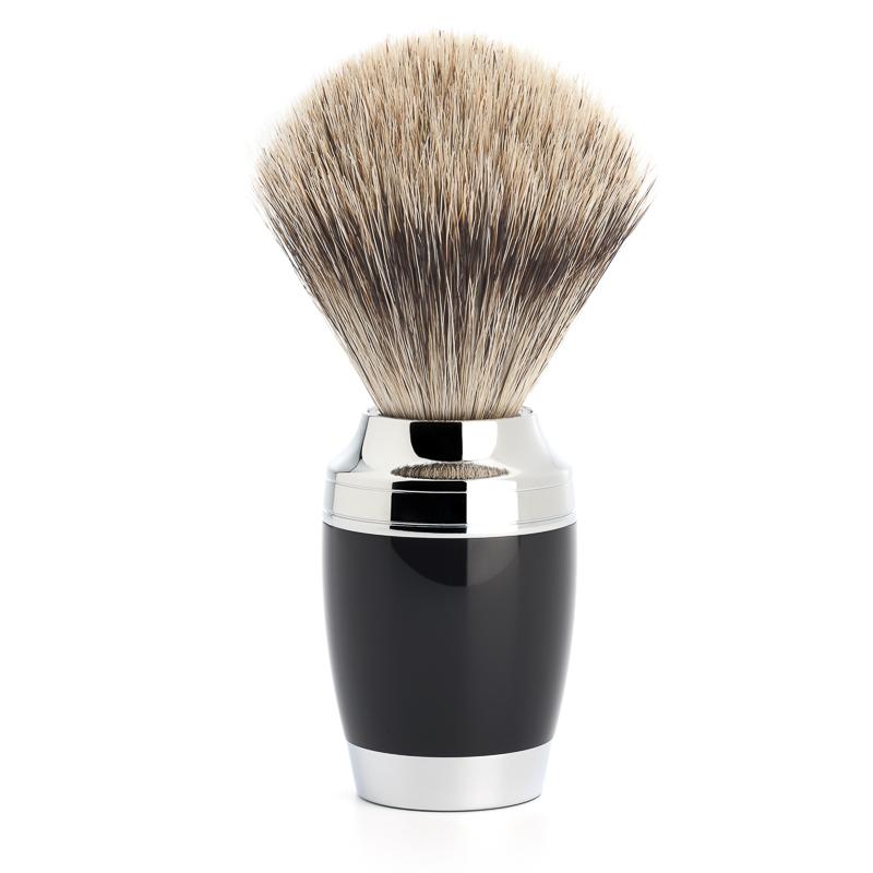 Kwast van Fijndas dassenhaar. Thuja wood, serie Stylo van Mühle. 21 mm, maat M. Scheerkwast gemaakt van Fijndas dassenhaar. De onderkant van het handvat is van verchroomd messing.