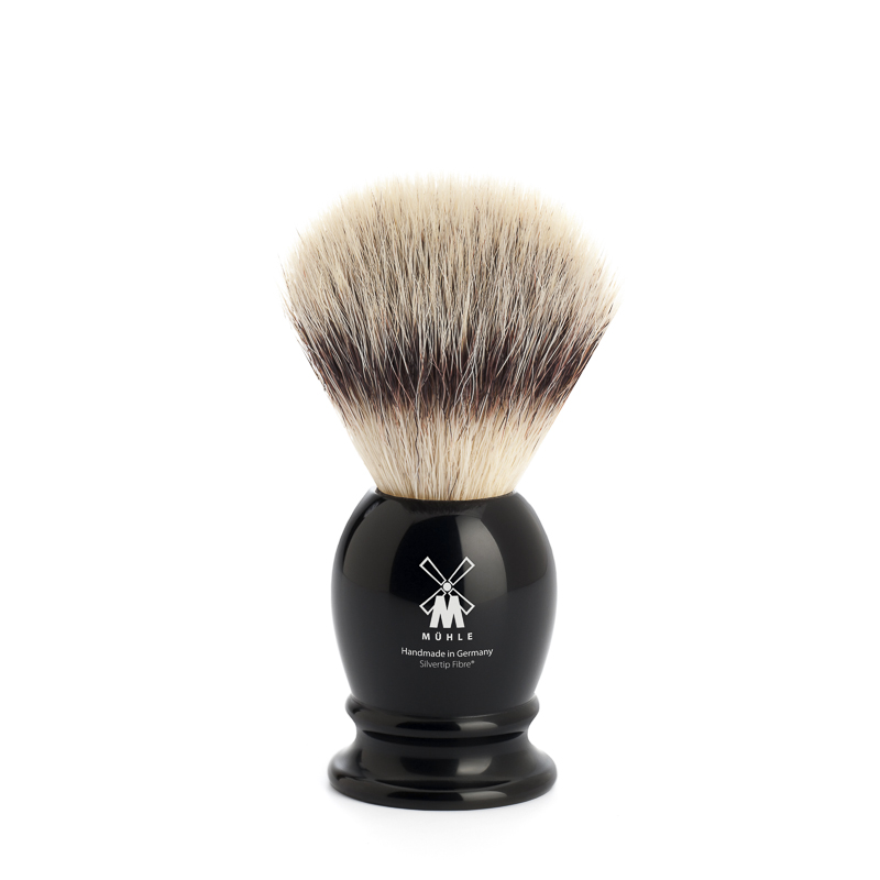 Kwast van Silvertip Fibre® dassenhaar. Hoornbruin, serie Classic van Mühle. 19 mm, Maat S. Scheerkwast gemaakt van Silvertip Fibre® dassenhaar. Handvat is van gepolijstedelhars.