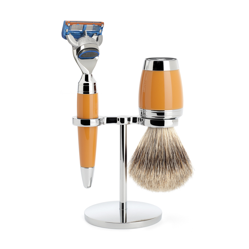 3 – delige scheerset uit de Stylo serie van Mühle.. De scheerset bestaat uit een houder, een Fijndas scheerkwast en een Gillette Fusion® scheermes. De Handvatten zijn gemaakt van Thuja wood.