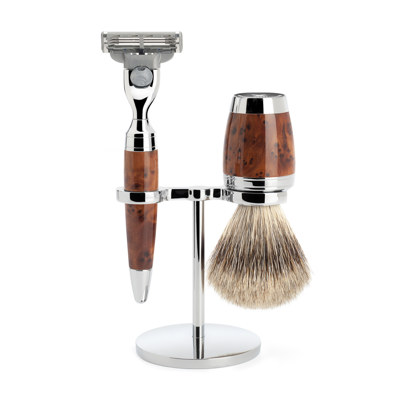 3 – delige scheerset uit de Stylo serie van Mühle.. De scheerset bestaat uit een houder, een Fijndas scheerkwast en een Gillette Mach3® scheermes. De Handvatten zijn gemaakt van Thuja wood.