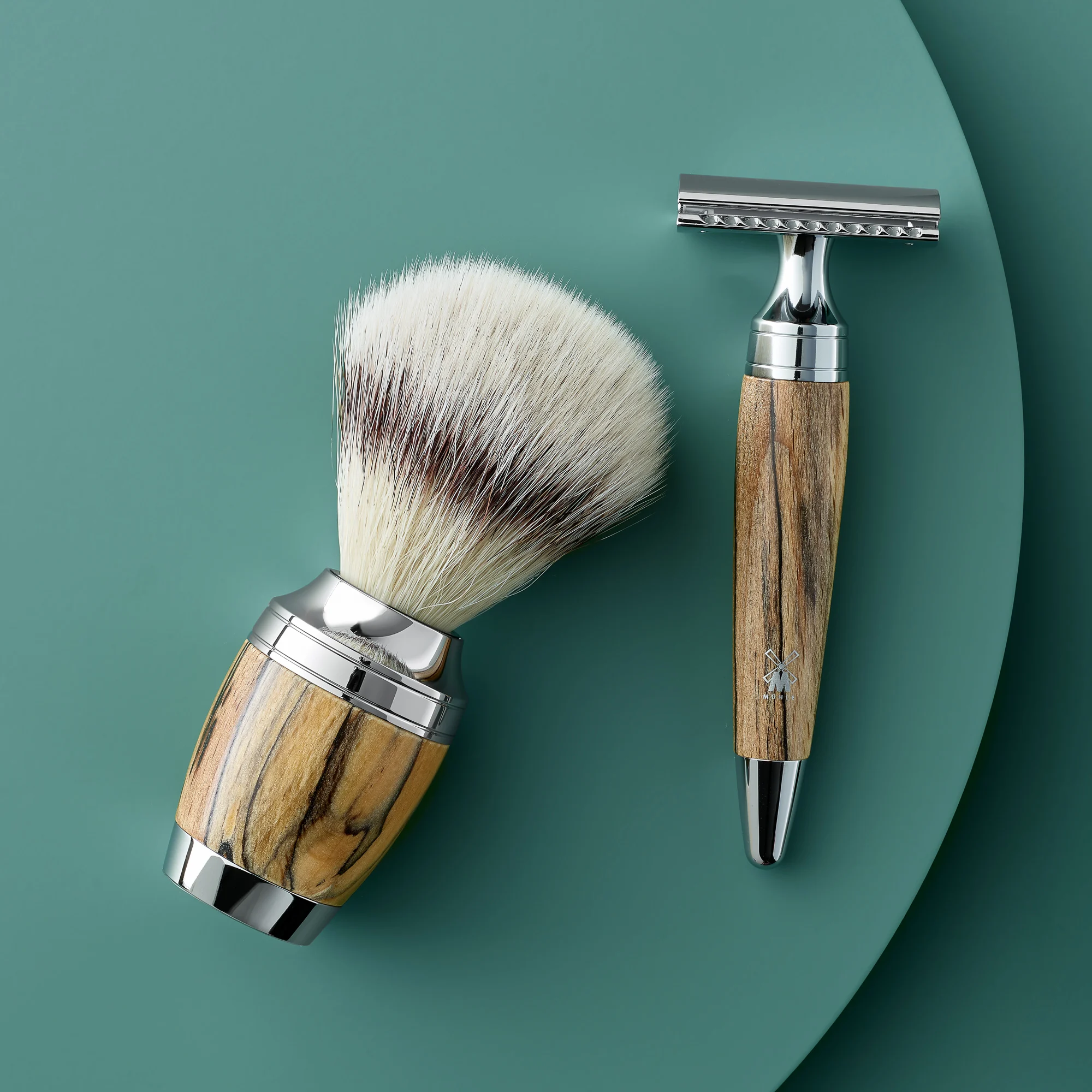 3 – delige scheerset uit de serie Stylo van Mühle. De scheerset bestaat uit een houder, een scheerkwast van Silvertip dassenhaar en een safety razor. De handvatten zijn gemaakt van Thuja wood.